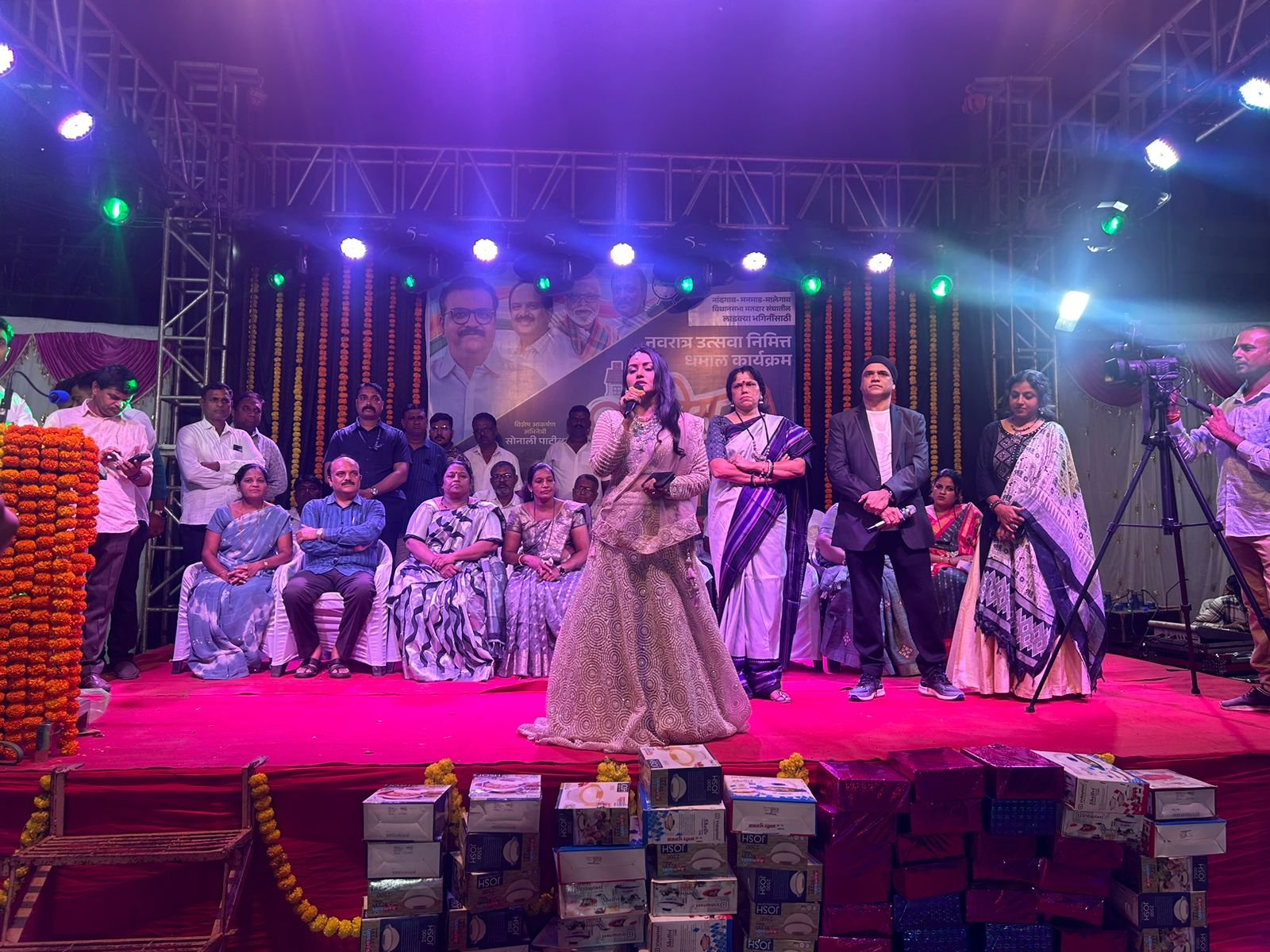 नाशिक,नांदगाव,दि.५ऑक्टोबर :- राष्ट्रवादी कॉंग्रेस पार्टीचे मुंबई अध्यक्ष तथा माजी खासदार समीर भुजबळ यांच्या संकल्पनेतून नांदगाव मनमाड विधानसभा मतदारसंघातील लाडक्या भगिनींसाठी नवरात्र उत्सवानिमित होम मिनिस्टर खेळ पैठणीचा या कार्यक्रमाचे आयोजन करण्यात आले आहे. आज नांदगाव येथे होम मिनिस्टर फेम भूषण कापडने, अभिनेत्री सोनाली पाटील यांच्या प्रमुख उपस्थितीत महाजन वाडा नांदगाव येथे मोठ्या उत्साहात हा सोहळा पार पडला. या प्रसंगी माजी खासदार समीर भुजबळ, माजी आमदार पंकज भुजबळ, डॉ.शेफाली भुजबळ यांनी उपस्थितांना नवरात्र उत्सवाच्या शुभेच्छा दिल्या.