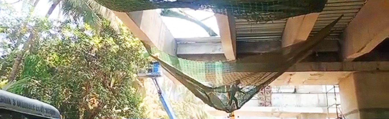 MMRDA ठेकेदाराच्या कामात सुरक्षा आहे ! चेंबूर येथे आज दुपारच्या वेळात रस्त्यात एक भली मोठी क्रेन ने लोखंडी सळया उचलून अर्धवट बांधकाम असलेल्या पुलावर ठेवलं जात असताना या पुलाच्या RCC सिमेंट माल भरण्यासाठी तात्पुरते लावलेल्या लोखंडी पत्र्यावर हा लोखंडी सळ्यांचा माल ठेवला जात असताना वाढीव वजनामुळे पुलावर असलेले पत्रे थेट रस्त्यात कोसळले .या वेळी काम करणारा एक मजूर थेट वरून जाळीत पडला. पुलाखालून एक प्रवासी बस रिक्षा जात असताना ही घटना घडली. नेट जाळीमुळे मजुराचा जीव वाचला.